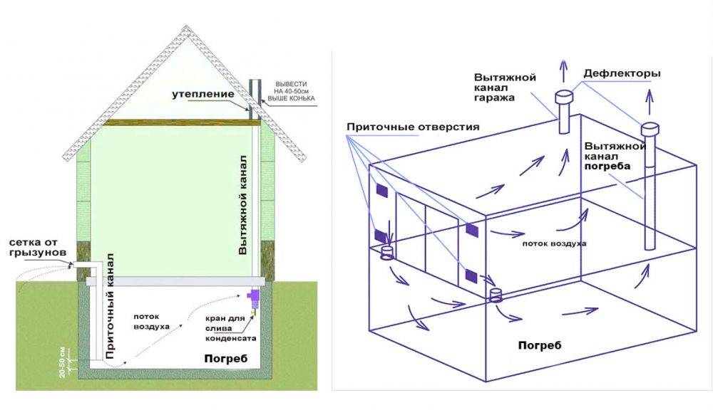 В процессе нагревания, воздух вбирает в себя частички жидкости и поднимается к потолку вместе с ними. При этом холодный воздушный поток опускается на дно помещения. Таким образом, создание вентиляционной системы приточно-вытяжного типа осуществляется исходя из разности температуры воздуха внутри погреба и непосредственно за его пределами.