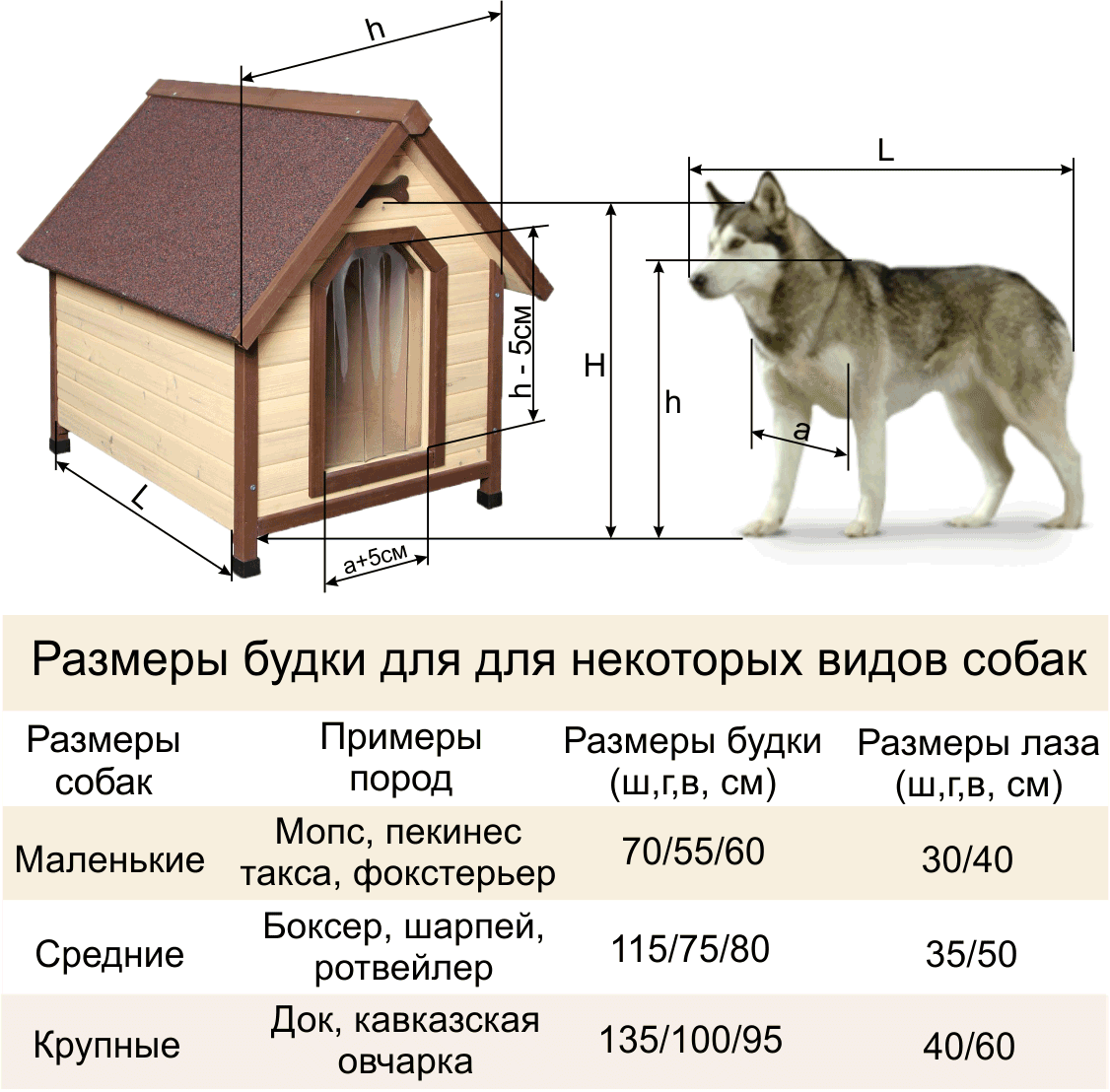 Чертеж будки производится с учётом размеров пса — мелкая порода, средних размеров или крупная. Высота будет равна росту собаки с поднятой головой, можно увеличить её сантиметров на 10-15 с учетом на подстилку, на возможное увеличение роста питомца. Глубина будет равна длине лежащей с вытянутыми лапами собаке, увеличенной на 10-15 см. Для расчёта параметров лаза измеряют высоту питомца в холке и ширину грудной клетки, прибавляют сантиметров 5 для свободного хода.