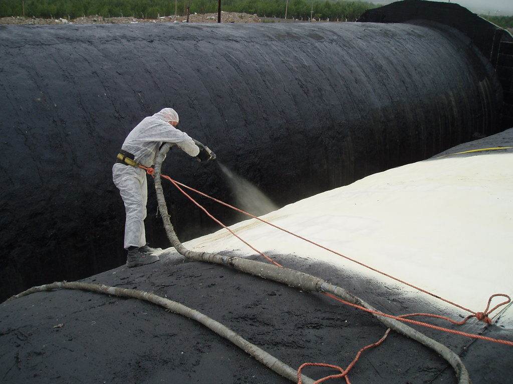 Эта технология отличается отсутствием швов и обеспечивает защиту магистралей сложной геометрической формы. Пенополиуретан наносится при помощи распылителя, после кристаллизации материал обеспечивает повышенную защиту от охлаждения. Для нанесения требуется использование специального оборудования, что увеличивает стоимость выполнения работ и не позволяет утеплить трубы самостоятельно.