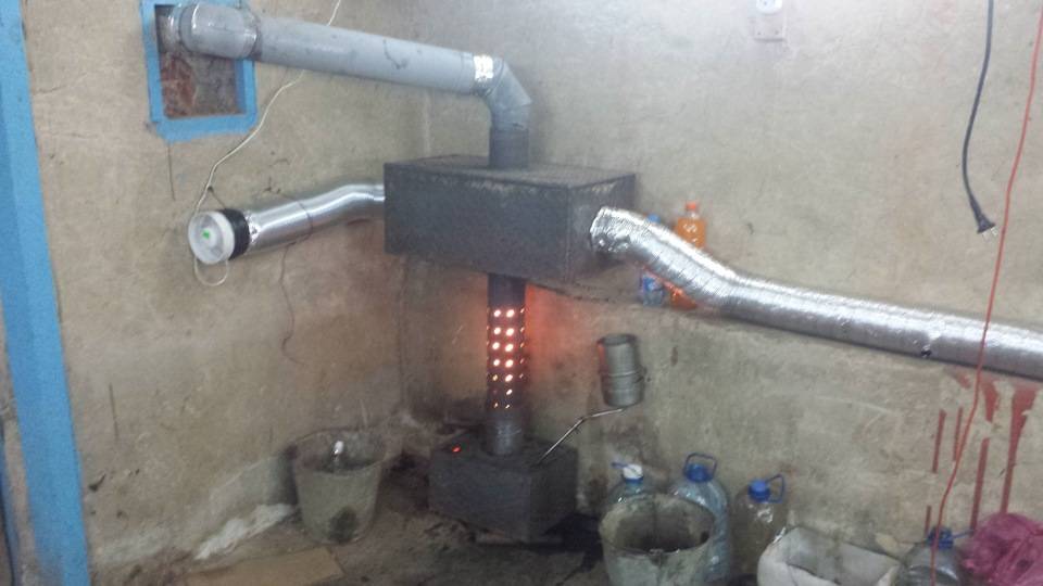 Буржуйка представляет собой корпус прямоугольной формы, разделенный по высоте на два отсека – топку и отделение для золы. Конструкция сваривается из стального листа толщиной более одного миллиметра (чем толще лист, тем дольше срок службы). Отсеки разделяют между собой прутьями диаметром от восьми миллиметров. Буржуйка устанавливается на ножки, отделяющие раскаленный корпус от пола. Если есть возможность найти отрезок чугунной трубы диаметром более 300 мм, можно изготовить буржуйку из нее. Чугун прослужит дольше, но не поддается сварке, поэтому конструкция должна собираться на болтах.