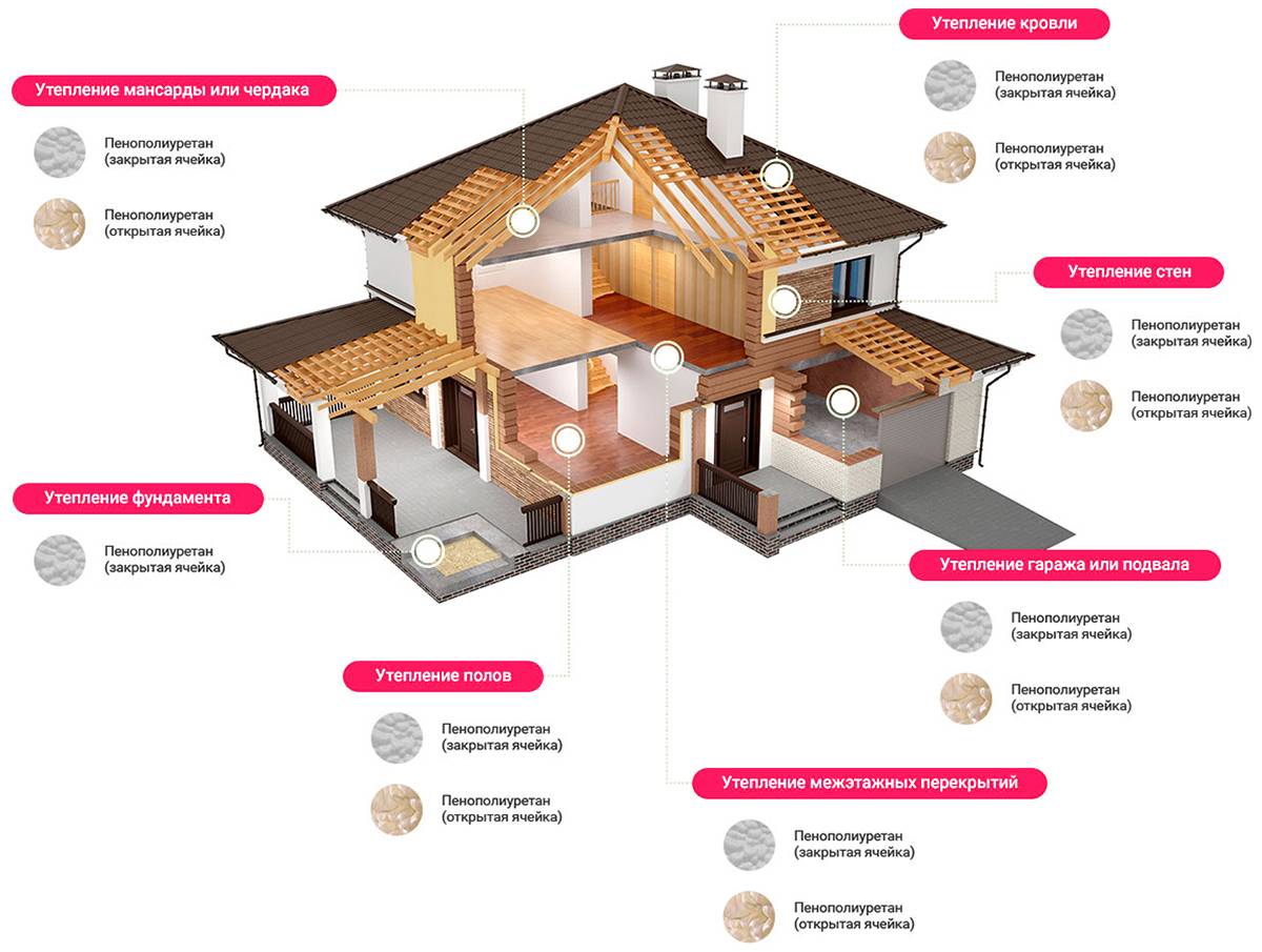 Закрытоячеистый пенополиуретан отлично подходит для изоляции подвалов, фундаментов и других конструкций, контактирующих с грунтом. Материал применим и для внешнего утепления. Открытоячеистый ППУ допустим для тепловой защиты кровли, перекрытий и стен, но требует водоотталкивающей отделки.