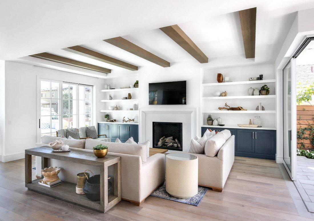 В современном мире стиль модерн в основном заключается в сочетании спокойных оттенков с контрастными тонами, а также простоте и рациональности. Кроме того, нередко в такой гостиной используется большое количество зеркал и стеклянных акцентов. Все это помогает визуально расширить пространство. Чаще всего такое оформление можно увидеть в частном доме. Ведь только в большой комнате можно установить камин по центру, тем самым сделав его главным очагом в доме. Если модерн был выбран для оформления квартиры, используйте фальш-камин. Но помните, что в таком случае топка должна быть ярко-выраженной с имитацией пламени и дров.