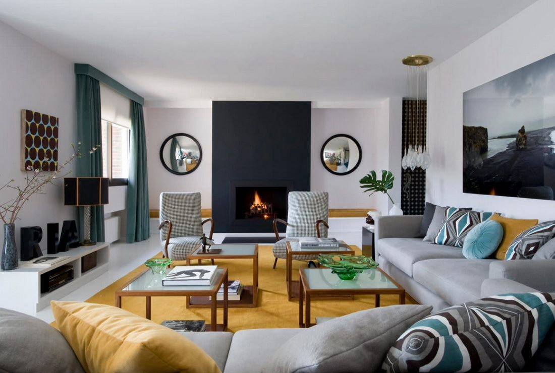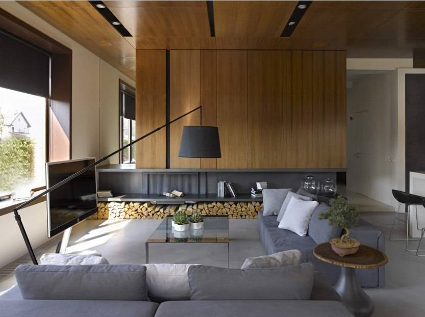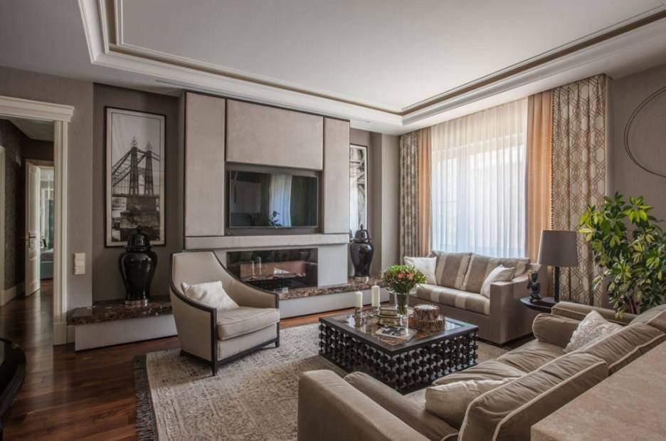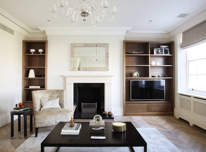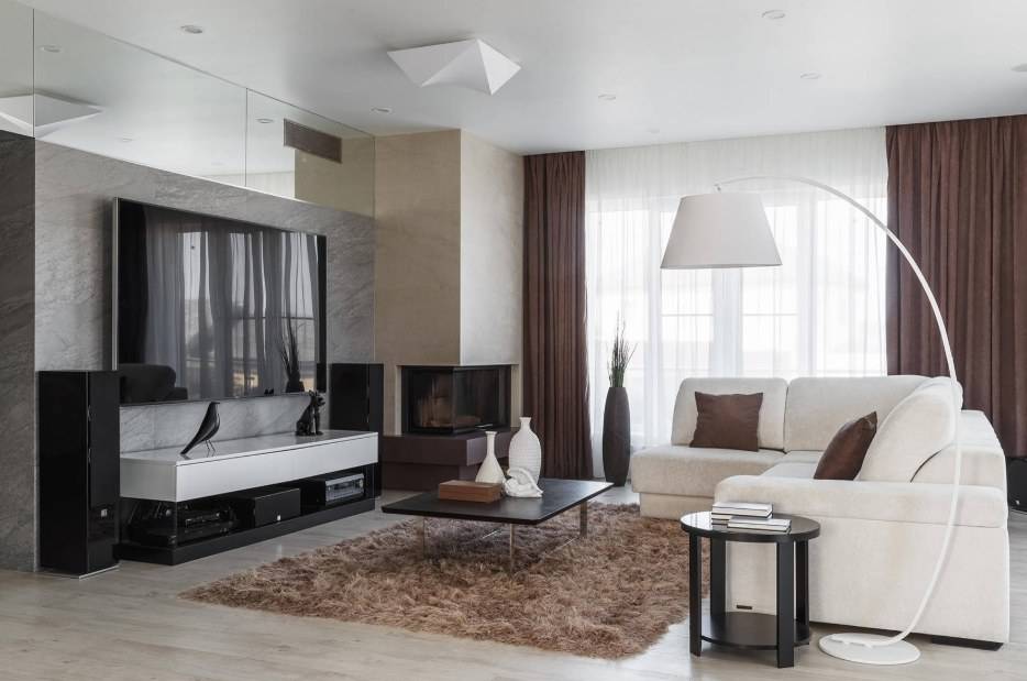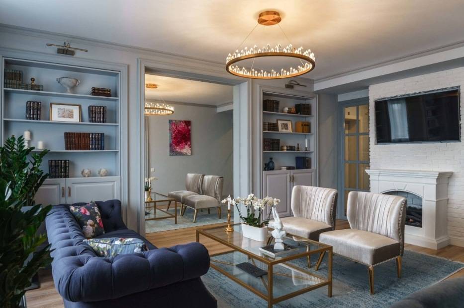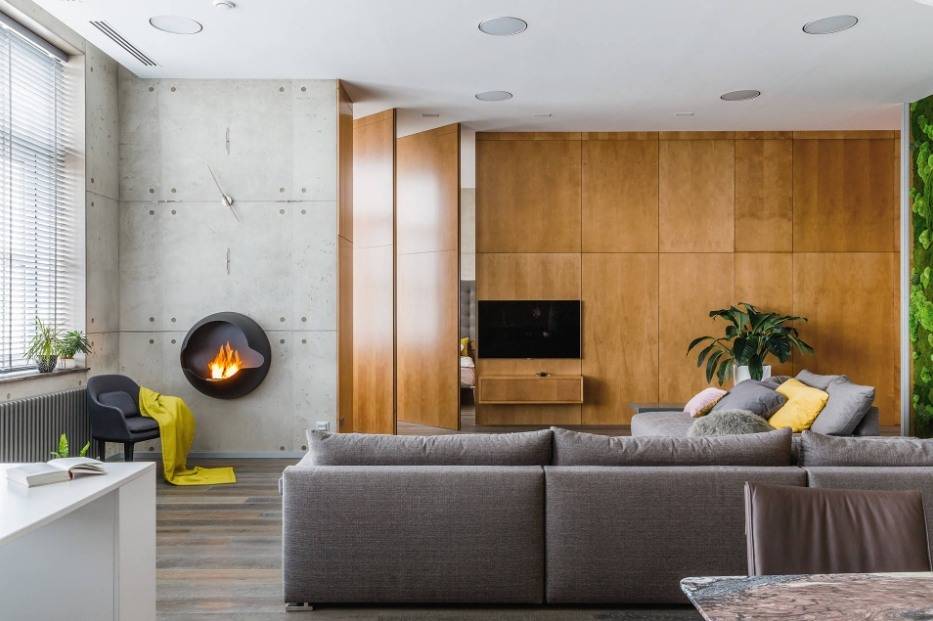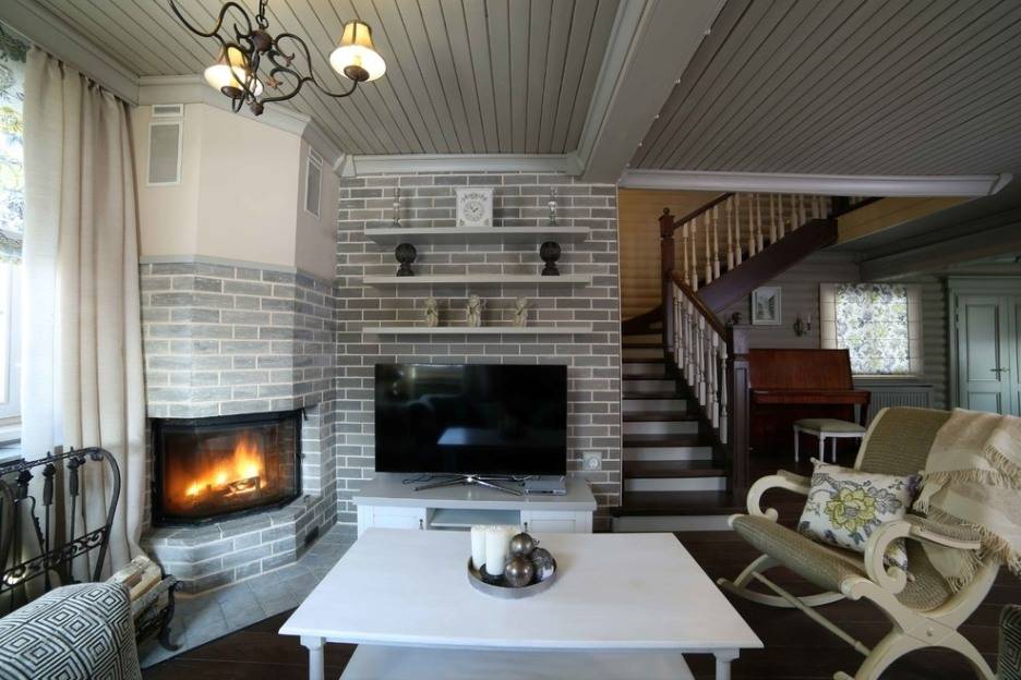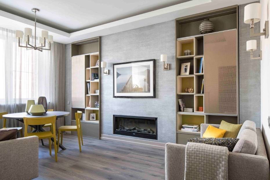 Интерьер гостиной с камином в квартире