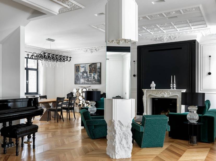 Камин станет центральным элементом кухни-гостиной в стиле арт-деко