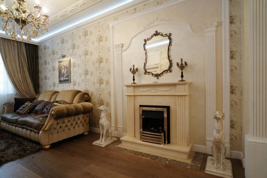 Противоположными принципами руководствуются приверженцы барокко. Наличие вычурных элементов декора, позолота и резьба только приветствуется. Это касается оформления интерьера гостиной в целом и отделки камина в частности. Имитация природного камня или натуральный мрамор – наиболее актуальный вариант решения декора.