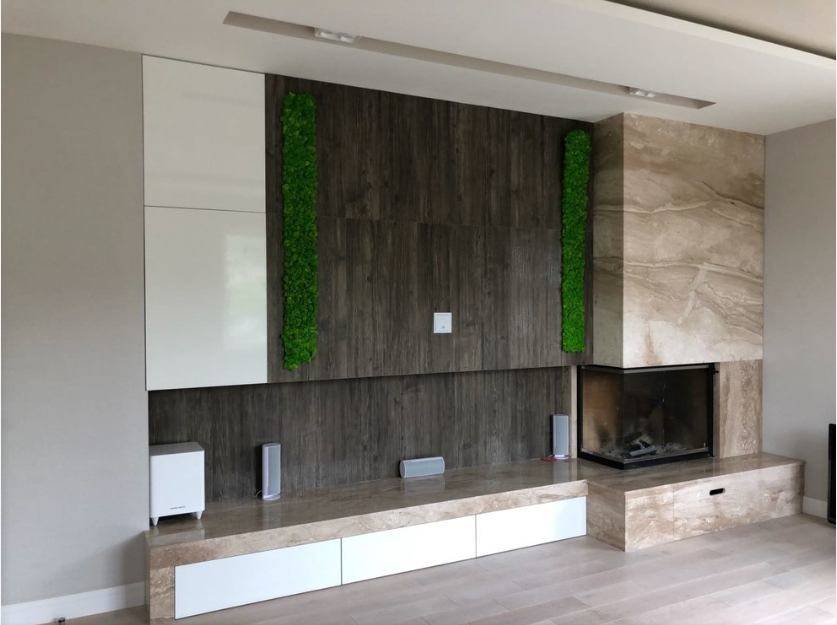 Совсем другой подход в оформлении поверхностей применяют для стиля модерн. Сочетание лоска и лаконичности предоставляет богатый выбор при обустройстве камина. Плавные линии, присутствие флористической тематики может быть выражено классическими или причудливыми формами.
