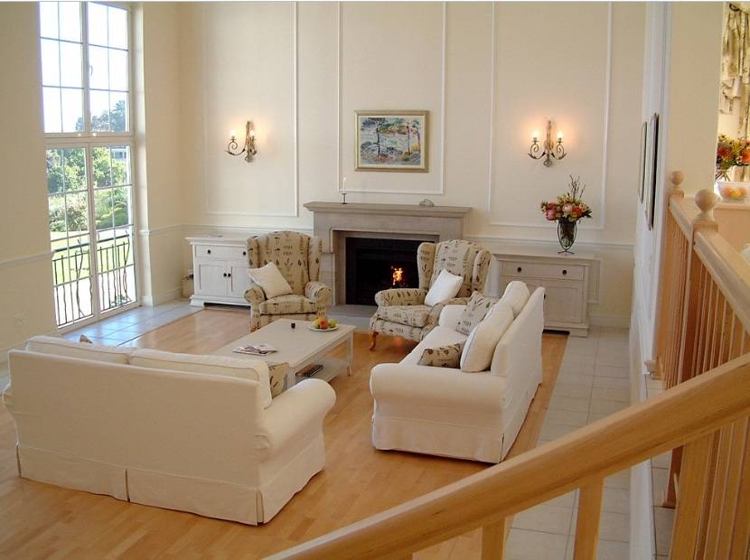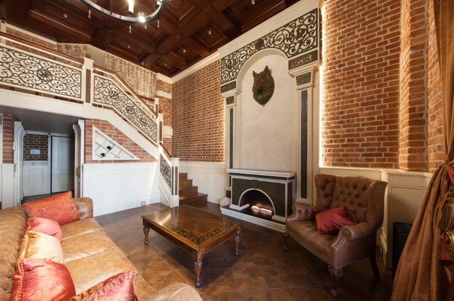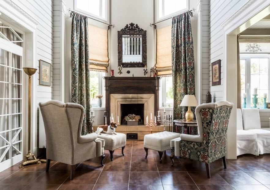 Данный стиль практически не встречается в уютных, небольших квартирах. Его преимущественно выбирают обладатели больших загородных домов. В них естественно предусмотрен массивный классический камин. Кстати в случае, если он выложен из камня, не стоит рассчитывать на ровные, гладкие линии. Что касается интерьера в целом, то гостиная должна быть оформлена со вкусом. Различные трофеи с охоты и оружие – самые распространенные декоративные детали подобных помещений.