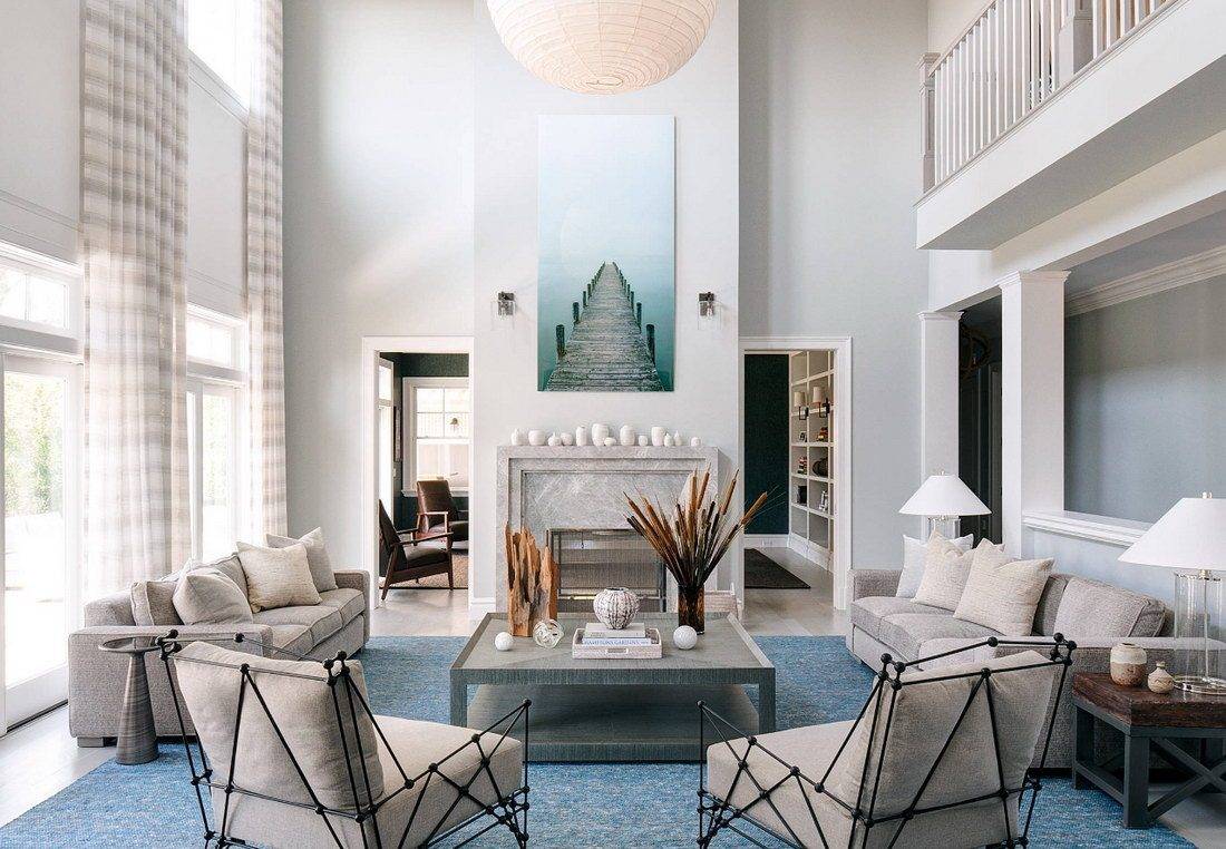 В целом можно сказать, что гостиная в большом доме просто создана для реализации интересных идей по ее оформлению. Речь идет не только о базовом наборе мебели, но и более интересных акцентах. К примеру, журнальный столик может быть выполнен из необычных материалов или в оригинальной форме. Многие и вовсе предпочитают сделать его самостоятельно. В качестве декора можно использовать совершенно разные предметы. Над камином отлично смотрится небольшая деревянная полка для книг или семейных настольных игр. При желании на ней также можно разместить памятные фотографии или же интересные фигурки. Особенно красиво над камином выглядит зеркало. Также в гостиной всегда уместными будут большие растения в горшках или вазах. Они добавляют нотку свежести в общий интерьер.