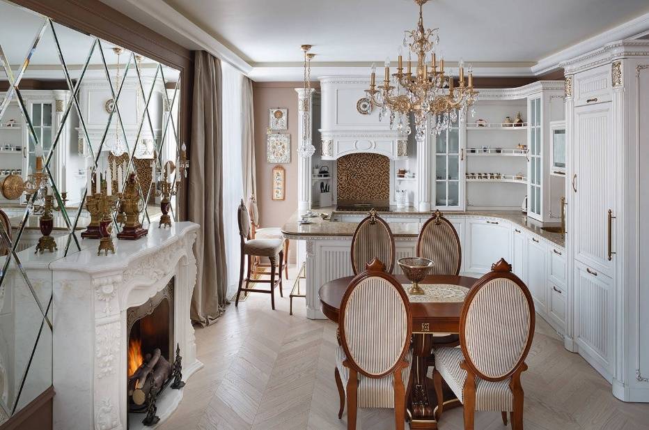 Каминная зона в классическом стиле – лучший вариант для кухни гостиной с классическими элементами. Гобеленовая обивка дивана для зоны отдыха, зеркала, резные детали фасада кухонного гарнитура идеально сочетаются с каминными часами, золочеными деталями, белым камнем камина.