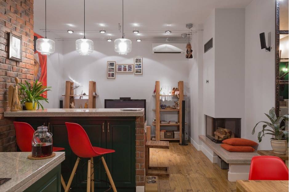 Площадь кухни-гостиной с камином должна быть не слишком маленькой — желательно, от 20 кв.м. и более.