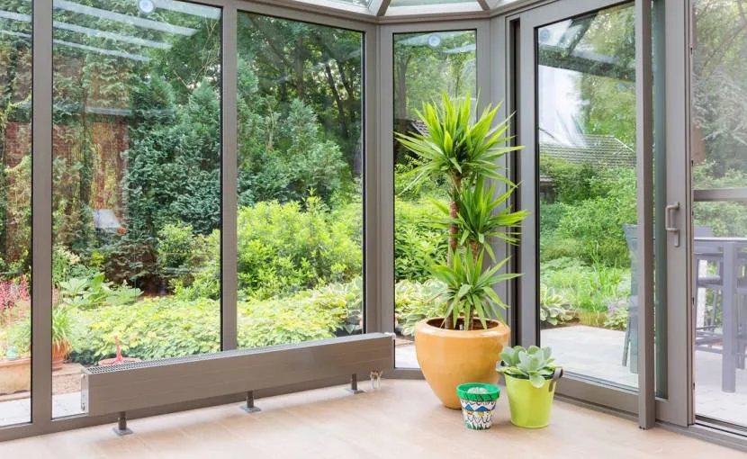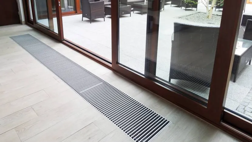 Последнее обстоятельство выступит несомненным плюсом в помещениях с панорамными окнами. Если расположить под ними конвектор, то конденсат в зимнее время не появится. Нередко небольшую модель встраивают в пол прямо у входной двери и тогда холодный воздух просто не способен проникнуть с улицы. Вариант отлично работает для помещений с большой проходимостью.
