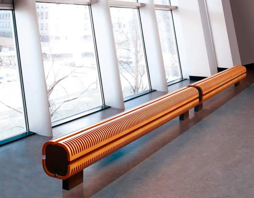 Но такое расположение не принципиально. Нередко в домах используют компактные напольные модели, которые устанавливают и посередине комнаты. Это делают, чтобы помещение быстрее и равномернее прогрелось. Причем современный дизайн прибора позволяет без проблем вписать его в любой интерьер. Хорошим примером выступает конвектор, сделанный в виде скамейки.