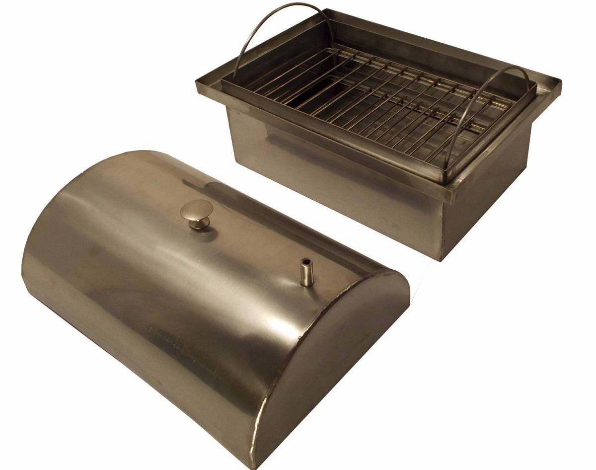Чтобы сделать надежную коптильную камеру, выберите прочный металл – нержавеющую сталь. С виду такая конструкция похожа на короб. Во внутренней части приваривают уголки для двух металлических решеток.