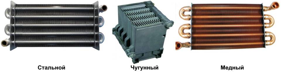Более мощные котлоагрегаты производятся в напольном исполнении. Они реже комплектуются встроенным оборудованием – его необходимо приобрести и смонтировать отдельно. Теплообменные аппараты устройств выполняются из стали (в т.ч. нержавеющей), чугуна, реже – меди. Наиболее надежными считаются теплообменники из чугуна (применяются только в напольных моделях), нержавеющей стали. Медь стоит дороже и зачастую склонна к прогоранию, поэтому применяется редко.