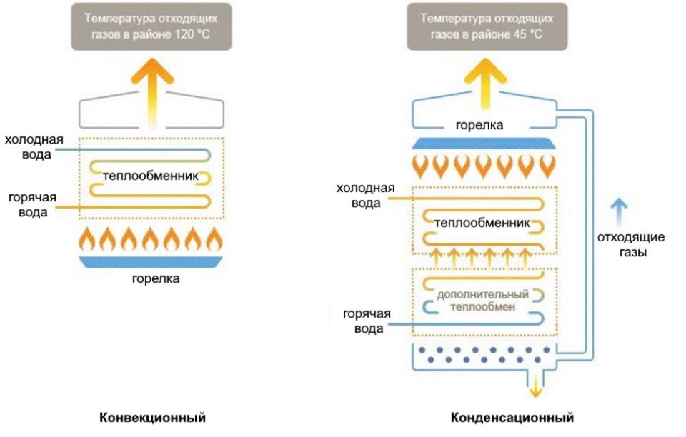 Котлы также делятся на конвекционные (прямой нагрев теплоносителя) и конденсационные (дополнительный нагрев за счёт испарения).