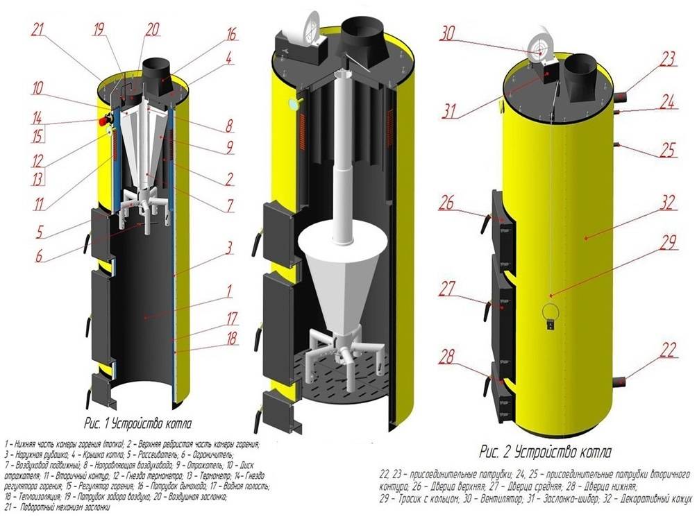 Внутренние составляющие части представляют собой, два цилиндра, которые установлены друг в друга, то есть маленький цилиндр вставлен в большой, который заизолирован от стенок корпуса специальной теплоизоляцией. Теплообменник находится между этими цилиндрами. В маленьком цилиндре располагается рабочая камера. Загрузка топлива выполняется через специальную дверку, которая установлена на лицевой стороне корпуса котла. Золу вычищают с нижней дверки. Строение котла выполнено таким образом, что сгорает лишь определенное количество топлива находящегося вверху.