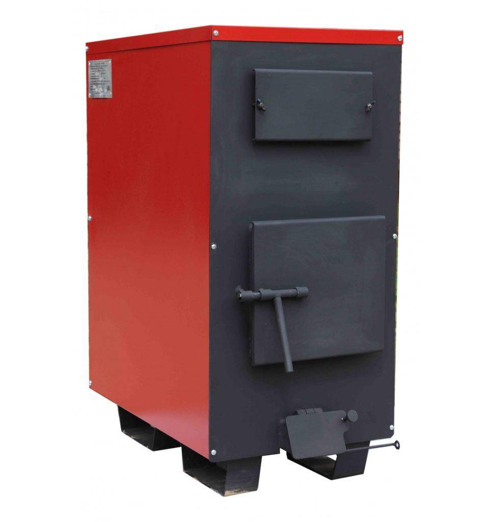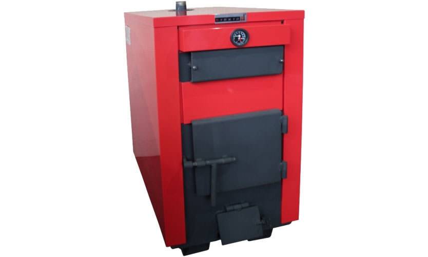 Котел подойдет для помещений с площадью 100 м². У него открытая камера сгорания с дверкой на фронтальной панели для подкидывания дров. В нижней части агрегата происходит пиролиз и сгорание газа, не оставляющего твердого остатка. В продаже есть твердотопливные модели с выходом патрубков для подключения как на правую, так и на левую сторону. Котел полностью энергонезависимый, но в нем опционально предусмотрена возможность установки ТЭНа. Выход дымохода с диаметром 120 мм облегчит поиск качественной трубы для монтажа канала, вытягивающего отработанные газы. Но производитель сэкономил на оснащении, поэтому в нем нет даже градусника.