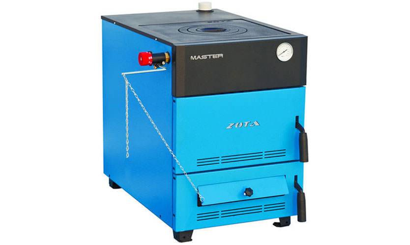 Котёл с высоким уровнем КПД (73%) и варочной панелью. Топить можно углём или дровами. Следить за показаниями системы удобно по встроенным манометру и термометру. Максимальная температура теплоносителя — 95 °C. Максимальное давление в контуре отопления — 3 бар. Отапливаемая площадь — до 144 м2. Цена — 26300 рублей.