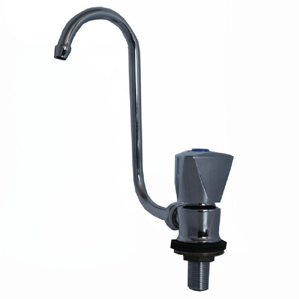 - с одним вентилем. Такие смесители могут подавать воду только одного вида — холодную или горячую. Используется преимущественно для установки на кухне или умывальнике. Корпус одновентильного крана выполняется из сплава меди или латуни. Запорный механизм — в виде керамической или червячной кран — буксы приводится в движение вентилем;