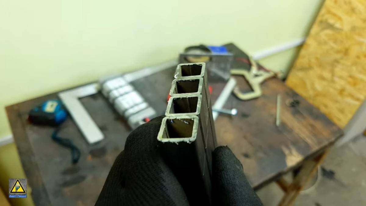 - Отрезанные части изделий соединяются мебельными петлями. Торцы трубы заглушаются квадратными накладками.
