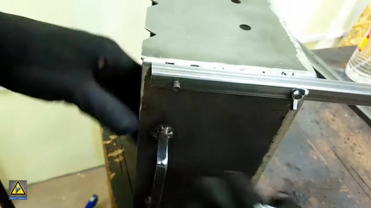 - Поочередно приваривается днище, а затем бортики. Вертикаль контролируется угольником. Дрелью высверливаются дырки для поддувала.