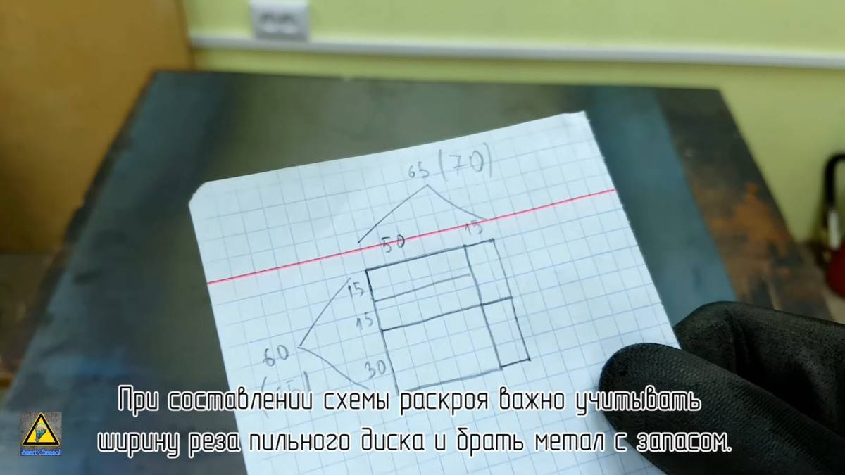 Так как этот мангал (в нашем примере) будет использоваться не очень часто, то металла толщиной 2 мм нам вполне хватит. Перед началом работы для удобства составили небольшую схему раскроя.