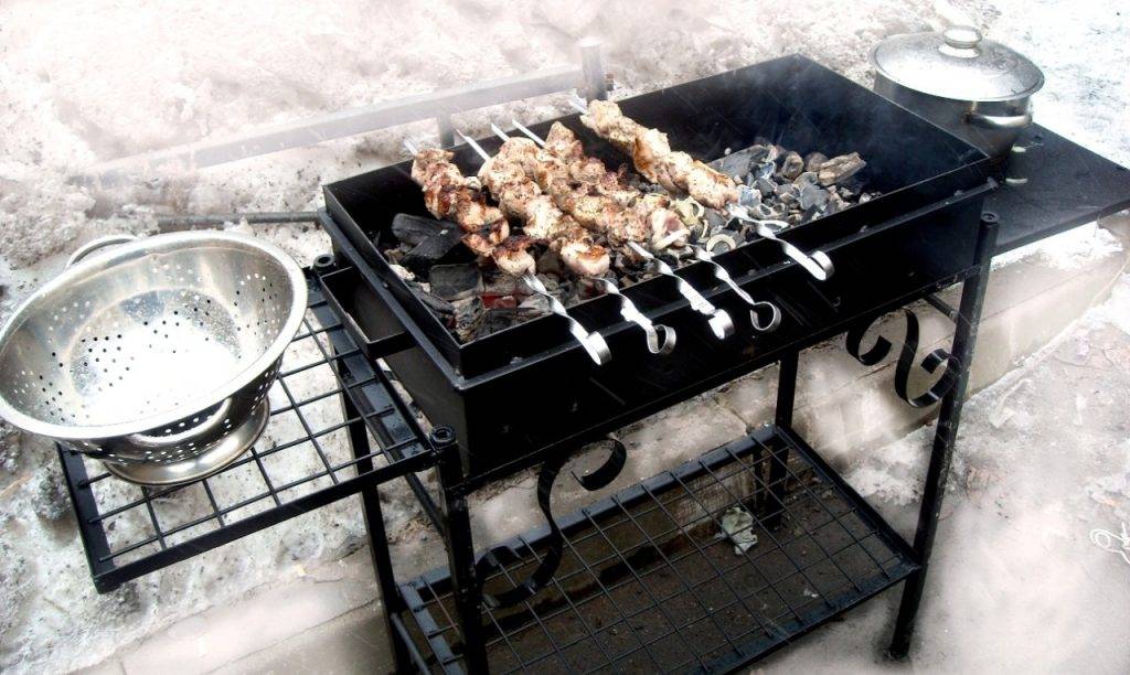 Типовой, простой вариант. Он используется только для шашлыка. По сути, это металлический прямоугольный короб (корпус), установленный на ножках. Внизу стенок короба просверливаются отверстия для воздуха, а внутри устанавливается решетчатый поддон для сбора пепла.