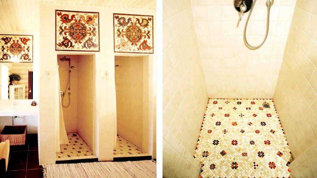 В деревянном доме душевая кабина из плитки не всегда смотрится наилучшим образом. Хотя бы в силу своей большой массы. Разумеется, никто не запрещает облицевать цоколь мозаикой. Напоследок заметим, что при изготовлении фундамента из полипропиленовой трубы, нужно предусмотреть в нем какую-то поддержку для центра поддона. В противном случае изделие легко продавится ногами