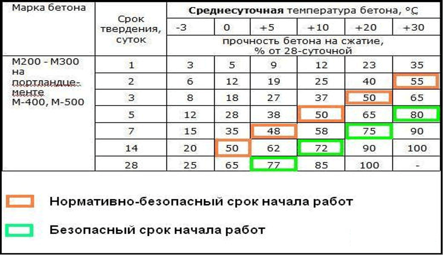 При этом по нормативным документам приемлемыми сроками начала работ с бетонированным объектам считаются такие, при которых достигнута 100% марочная прочность, а снятие опалубки предполагается после достижения 70% готовности состава.
