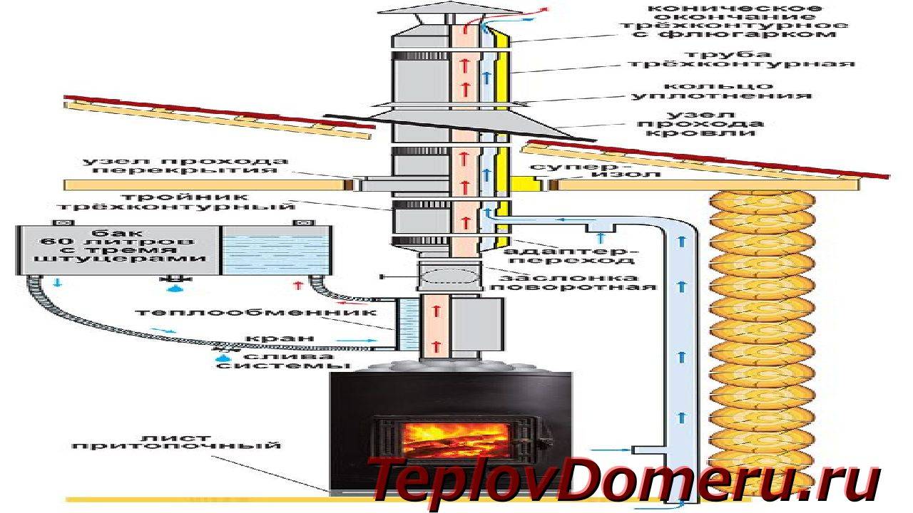 За счет легкого веса и простоте устройства, дымоход из сэндвич труб можно собрать самостоятельно и вывести его через крышу.