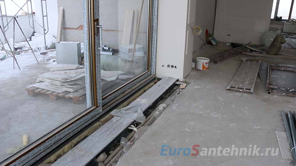 Следует взять во внимание следующий нюанс. В нашем случае смонтировано 3 внутрипольных конвектора водяного отопления, каждый из которых достигает 1800 см в длину