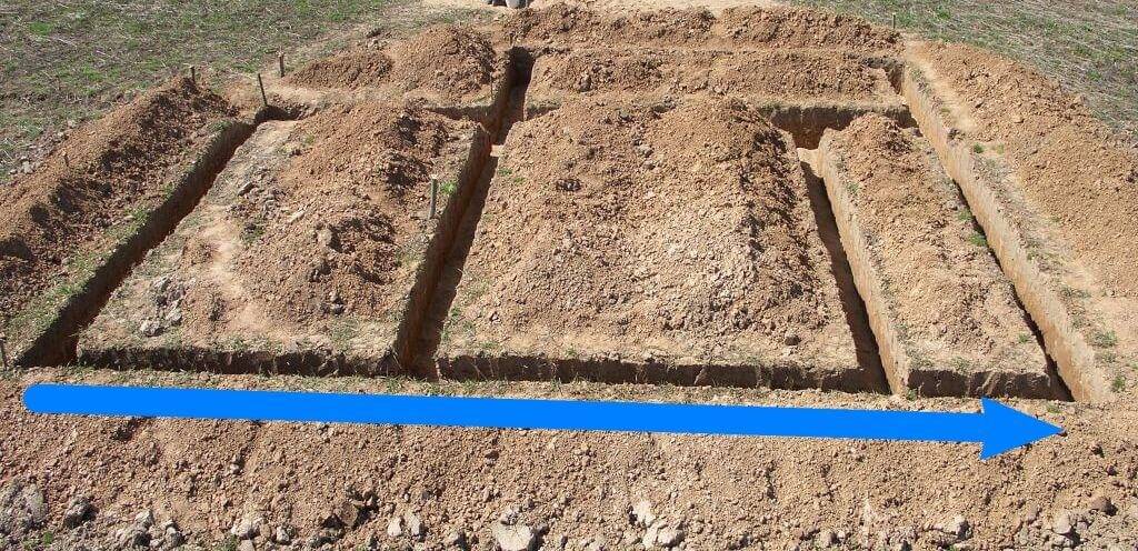 - Закладка в траншею присыпки. Смачивание, выравнивание и уплотнение подушки. Заливка на дно тонкого слоя цементного раствора для устранения возможных щелей.