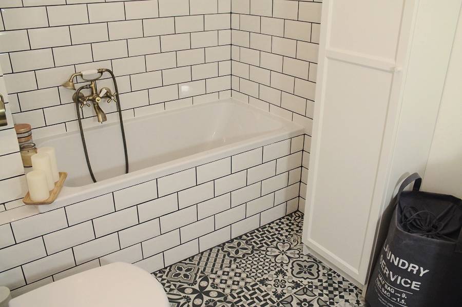Дизайнерские “ходы” могут не только обновить вид плитки, но и придать всей комнате совершенно новый облик. Тут вы можете не ограничивать свою фантазию. Я вот использовала в некоторых местах трафарет и краску, чтобы заделать царапины.