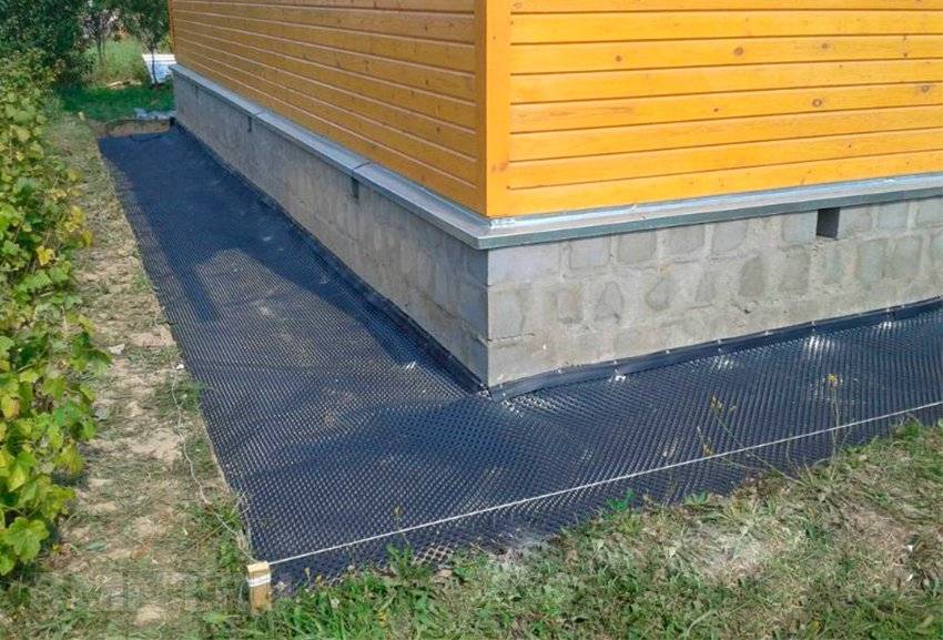 - Поверх первого слоя кладется гидроизоляционная строительная пленка черного цвета. Со стороны дома должна внахлест находить на фундамент на несколько сантиметров.