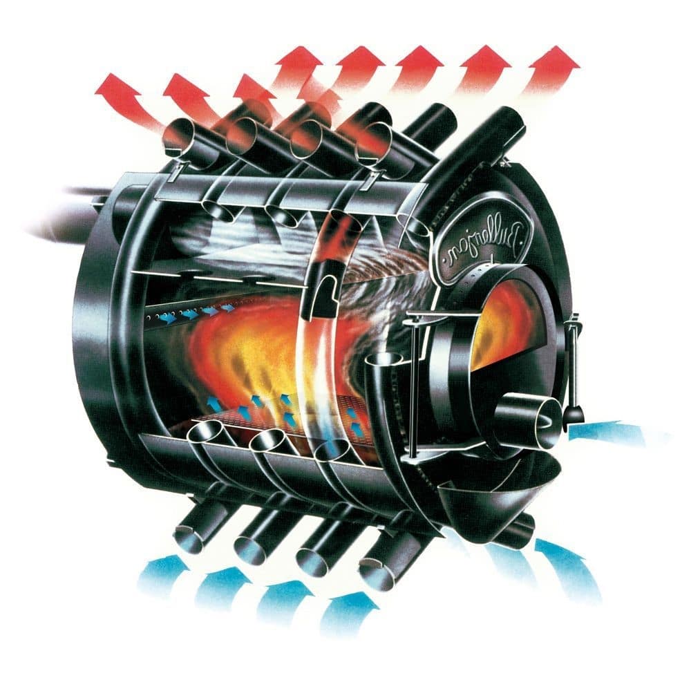 Если обычная печь типа буржуйки греет за счет теплового излучения от своего корпуса, то Булерьян без водяного контура греет за счет конвекции. Здесь используются трубы достаточно большого диаметра, полностью охватывающие камеру сгорания. Проходящий через них воздух нагревается до температуры +100-120 градусов и попадает в комнаты. Такая схема обеспечивает очень быстрый прогрев помещений.