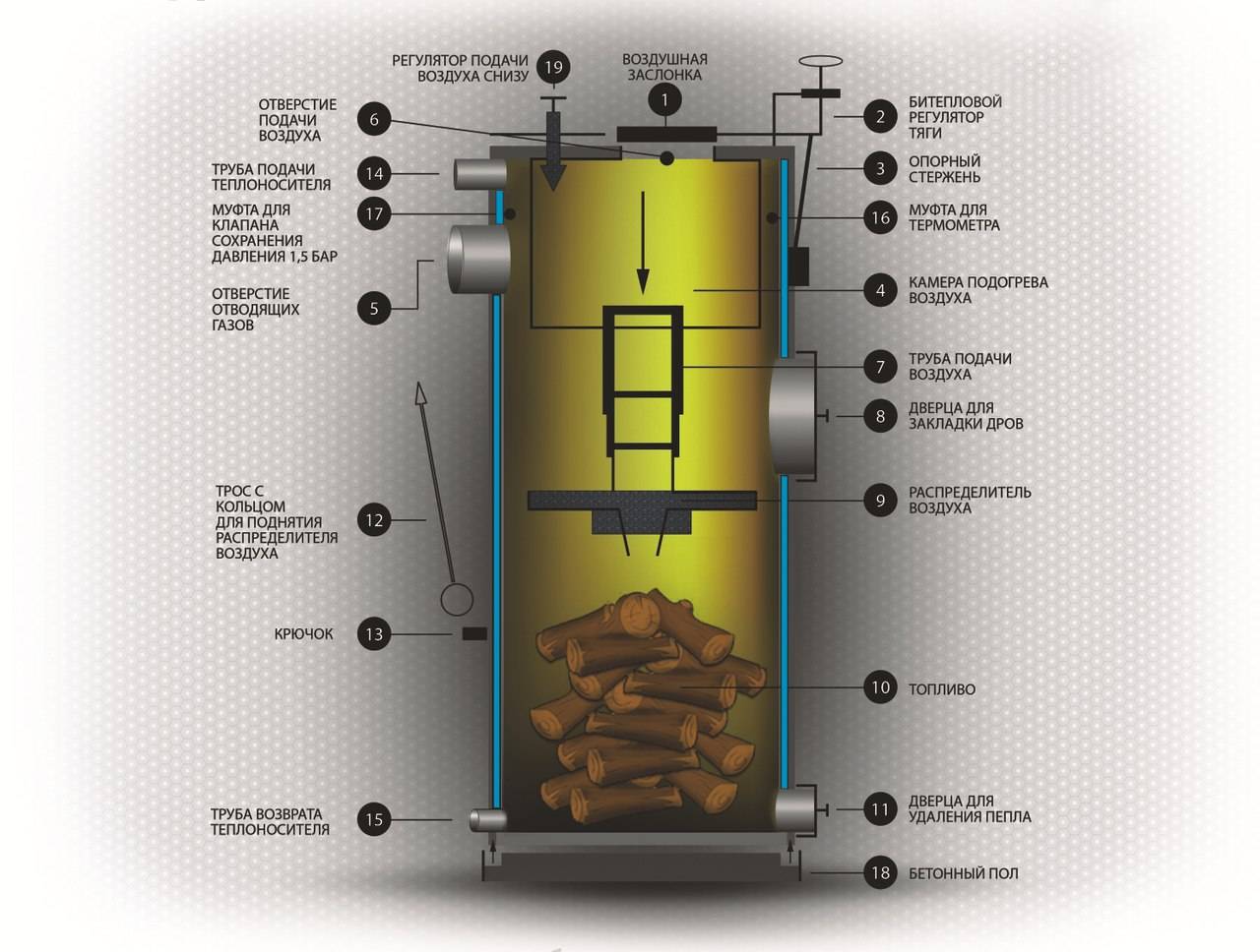Агрегат удобно использовать, т. к. после загрузки можно долго не открывать топку. В процессе перегорания дров или угля выделяется горючий газ, который собирают в камере, где он догорает и выделяет энергию.