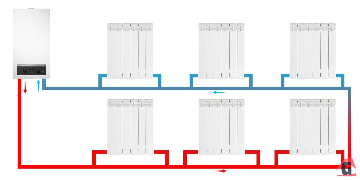Устройство горизонтальной двухтрубной системы автономного отопления с принудительной циркуляцией является наиболее распространенным вариантом обогрева частного дома. При этом используется одна из трех схем: