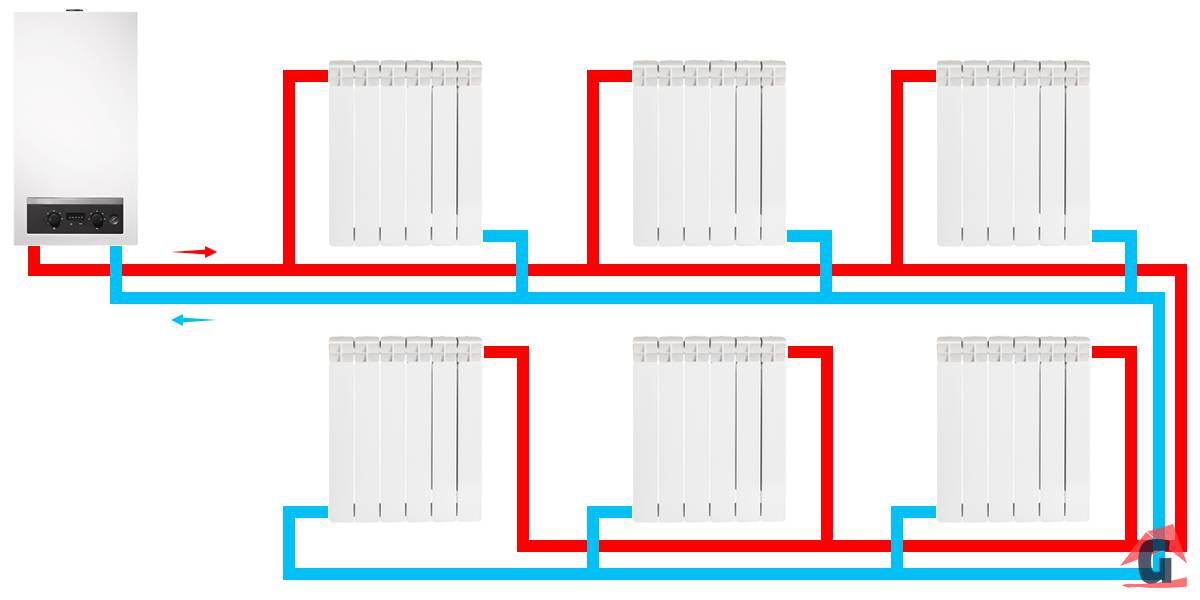Основным отличием двухтрубной схемы обогрева частного дома является подключение каждой батареи к магистрали как прямого, так и обратного тока, что увеличивает в два раза расход труб. Зато у владельца дома появляется возможность регулирования уровнем теплоотдачи каждого отдельно взятого отопительного прибора. В итоге можно обеспечить разный температурный микроклимат в комнатах.
