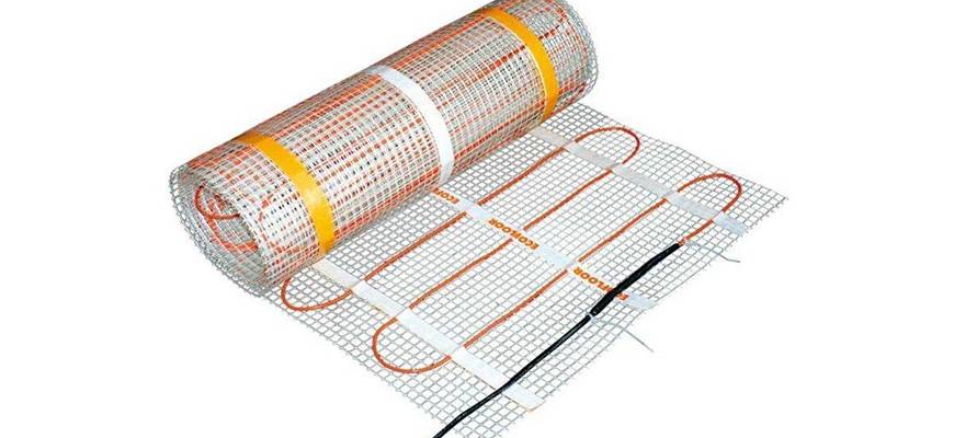 - Нагревательные маты. Представляют собой сетку, на которой закреплены двухжильные провода. Маты имеют вид квадратов или полос, которыми застилают площадь. Неудобно использовать ленточные элементы в труднодоступных местах. Перерезать кабели нельзя. Необходимо удалять излишки сетки, подстраивая мат под форму изгиба.