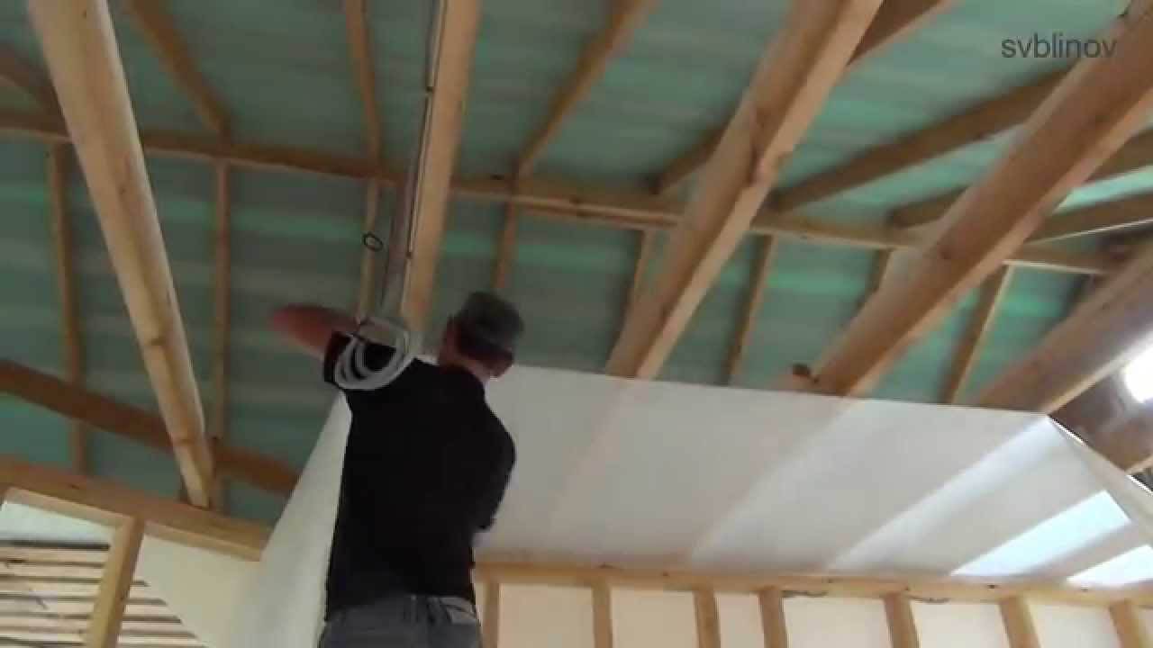 - Закрываем чердак — чистовой потолок крепится к пароизоляции. По обрешетке, направляющим производится монтаж чистового потолка (ОСП, гипрок и т.п.). В целях наилучшей противопожарной защиты рекомендуется «зашивать» потолок листами гипсокартона в 2 слоя.