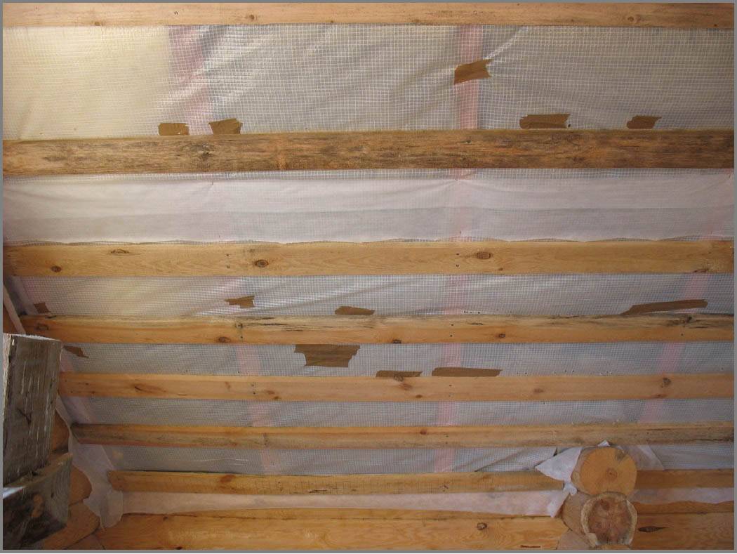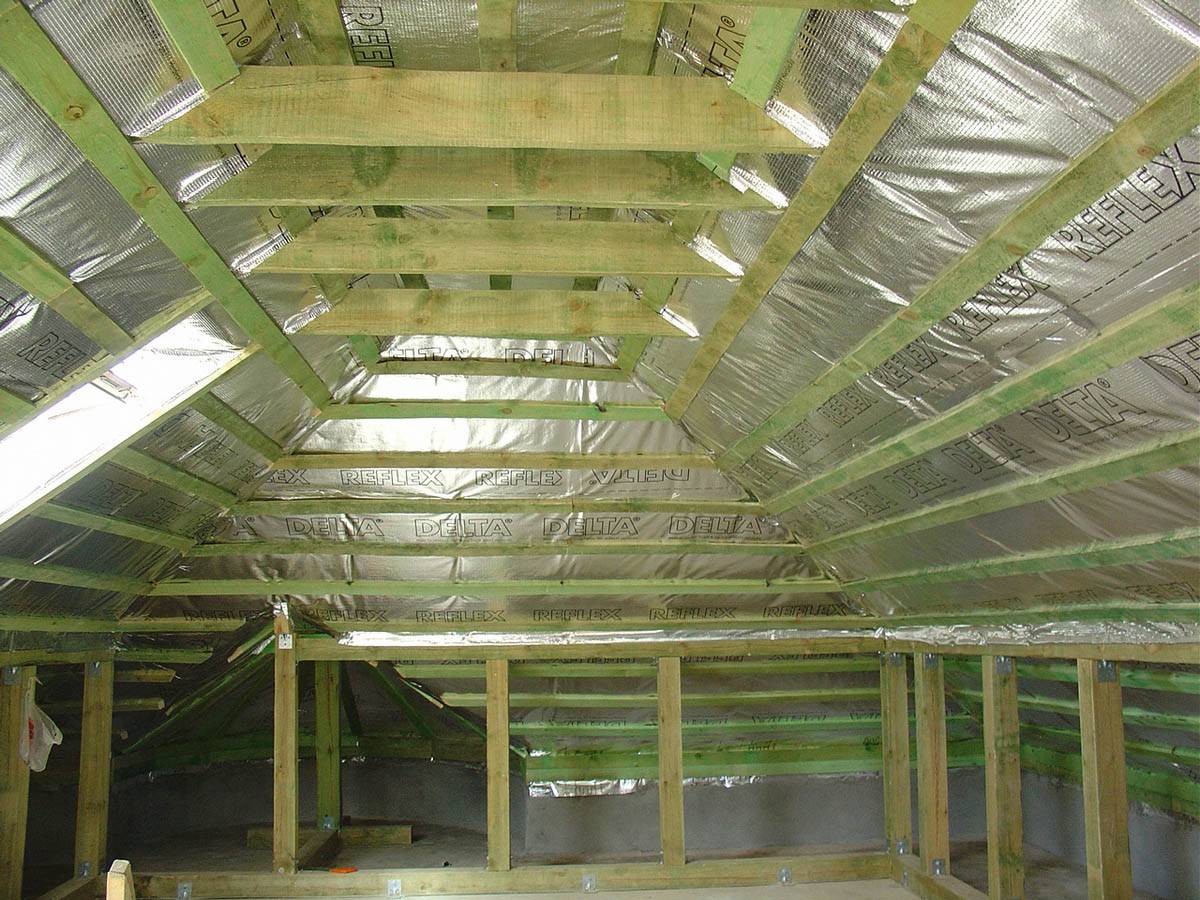 - Пароизоляция чердачного перекрытия по деревянным балкам — крепится с помощью строительного степлера снизу к черновому потолку (обрешетке), что позволяет отсекать пары от всей конструкции перекрытия. Необходимо делать перехлесты рулонов пароизоляции не менее 15-20см и тщательно их проклеивать алюминиевой клейкой лентой. Обязательно формировать напуски на стены 15-20см и тщательно их проклеивать (заводить под штукатурку и другую отделку стен). Тщательно герметизировать места прохождения через чердачное перекрытие дымоходных, вентиляционных труб и других инженерных коммуникаций с помощью специальных рукавов. Наилучший материал в качестве пароизоляции — это полиэтиленовая плёнка высокой плотности от 200г/м² и выше.