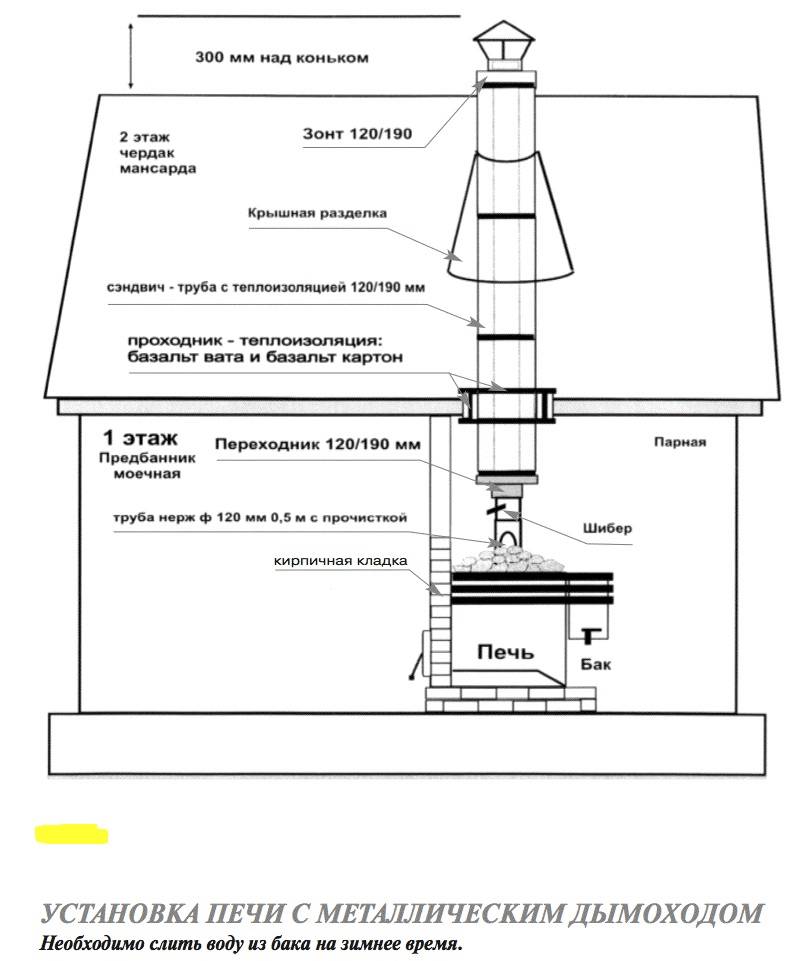 Важно, чтобы наружный конец дымовой трубы выступал минимум на полметра над коньком крыши бани.