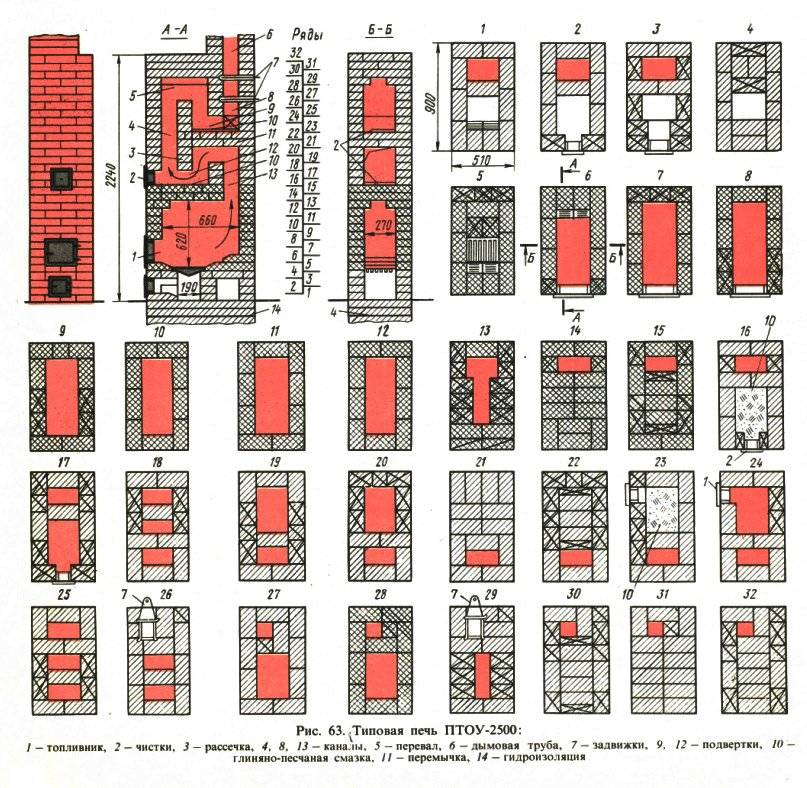 - С 30 по 32 ряды кладка выполняется сплошная, а на 32 начинает формироваться дымоход;