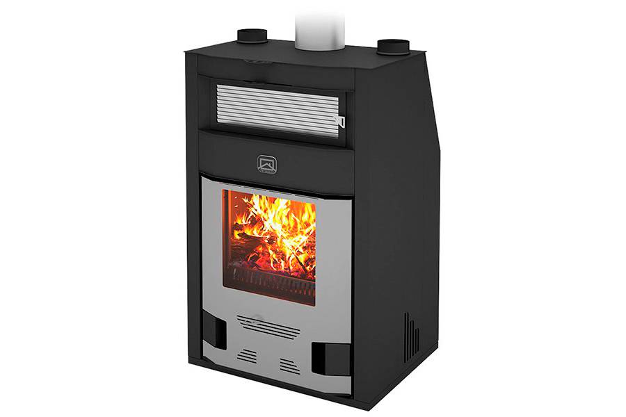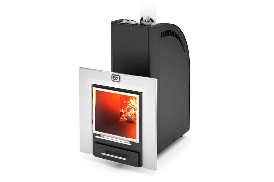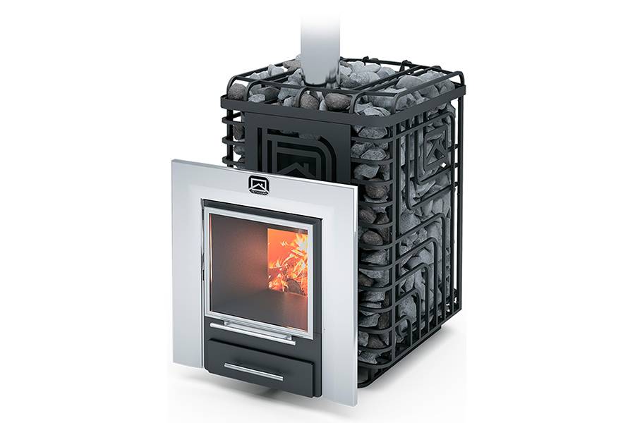 Этот агрегат является идеальным вариантом для бани с парилкой до 18 м³. Отличительным признаком печи является то, что в конструкции предусмотрено окно для очищения дымоходной трубы. А также она имеет встроенный бак для воды, выполненный из нержавейки объемом 60 литров. Конструкция устройства разрешает устанавливать его как в парилке, так и на два смежных отделения.