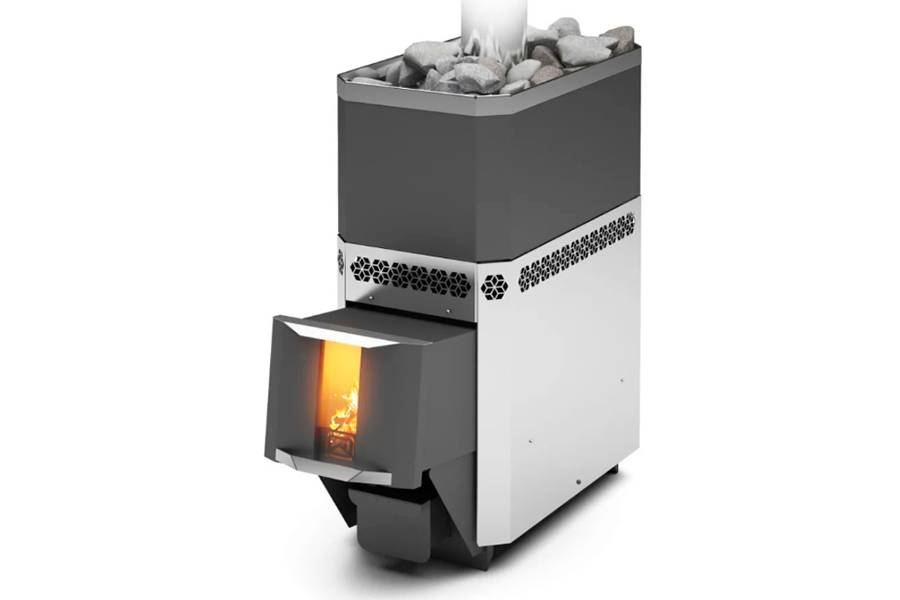 Модель с расположением камней под наклоном, что позволяет получить необычный пар в помещении. Стеклянная дверца печи позволяет любоваться пламенем во время посещения парной.