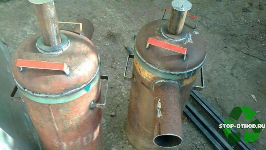 Её легко изготовить из газового баллона, работает на опилках, угле, дровах и древесной коре; пламя горит сверху вниз