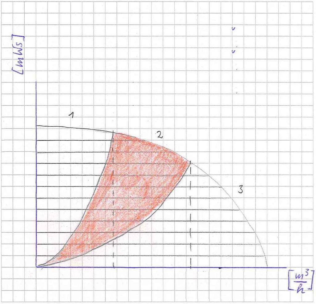 - Область минимальной потребности системы в теплоносителе. Если рабочая точка находится в этой области, нужно выбрать меньший насос.