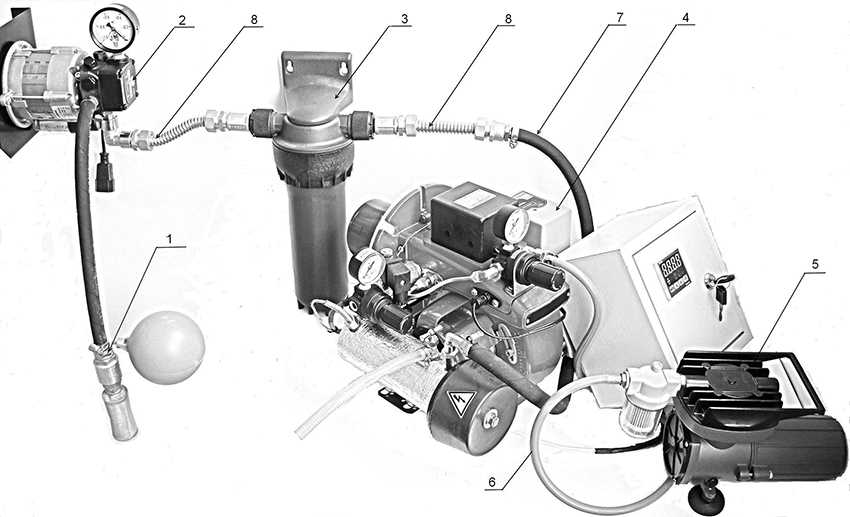 Схема сборки горелки, где 1 – топливозаборник; 2 — топливный насос; 3 – топливный фильтр; 4 – горелка; 5 – компрессор; 6 – шланг воздушного компрессора; 7 — топливный шланг; 8 – топливопровод.