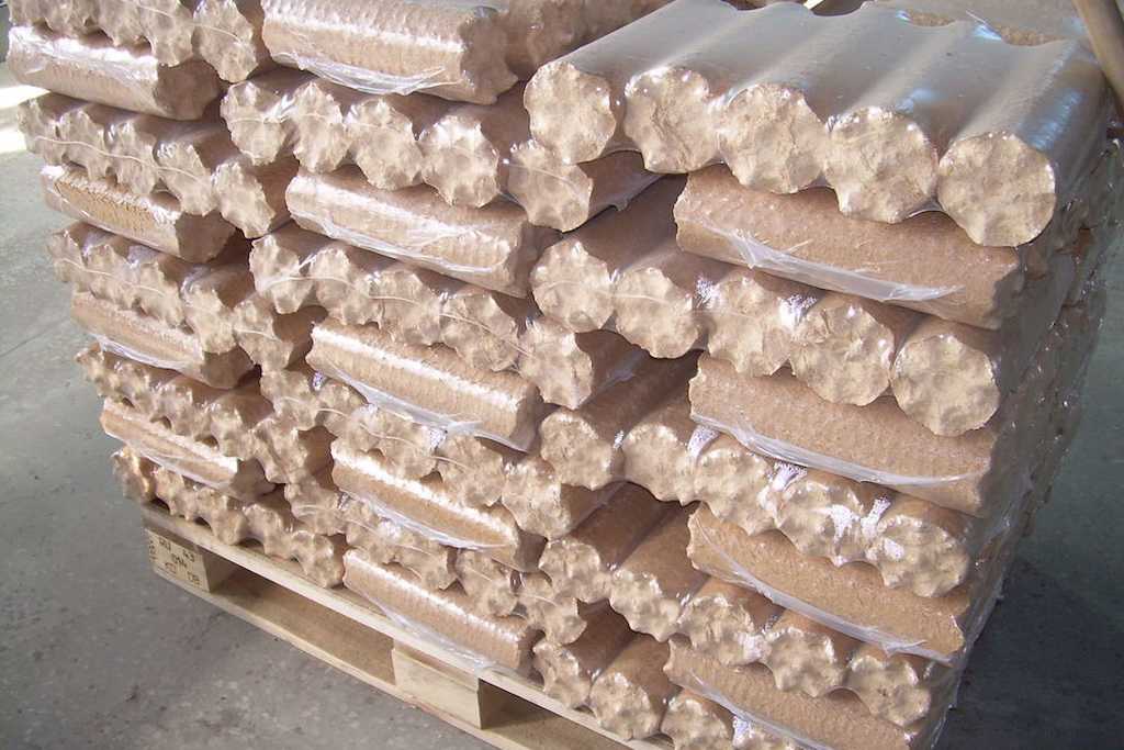 - Дерево. Функцию основы в таких продуктах выполняют спрессованные опилки, стружка, кора и другой неформат. Сначала они поддаются нагреванию, а потом приобретают форму при помощи пресса. А при нагревании древесная масса выпускает специальное вещество – лигнин, которое за своими качественными характеристиками напоминает клей. Благодаря лигнину брикеты удерживают свою форму на протяжении всего периода изготовления и эксплуатации. Альтернатива дровам в виде топливных брикетов отличается высокой теплотворностью — примерно 4300-5000 ккал/кг.