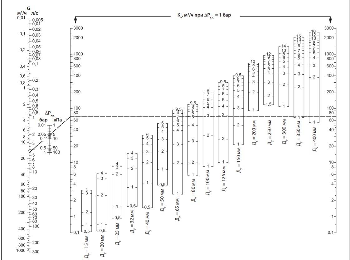 К примеру, при определении положения индикатора настройки модификации MSV-F2 с условным проходом Ду равным 65 мм. при интенсивности потока 16 м. куб./ч. и перепадам давлений в 5 кПа. (рис.11) на графике соединяют точки на соответствующих шкалах расхода и напора и продлевают линию до пересечения условной шкалой коэффициента Ку.